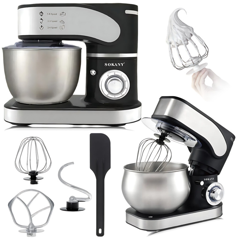 Планетарный тестомес Sokany SK-05002, 7.5 л, 2000 Вт — мощный кухонный миксер с чашей из нержавеющей стали и комплектом насадок