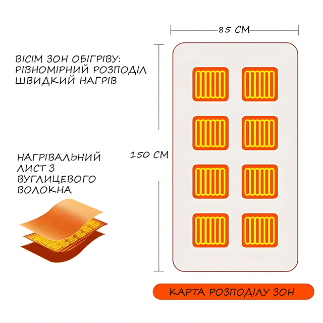 - 8 углеродных нагревательных элементов: Благодаря нагревательным элементам из углеродного волокна плед быстро прогревается и равномерно распределяет тепло по всей поверхности. Это позволяет избежать холодных участков и обеспечить постоянное комфортное тепло;