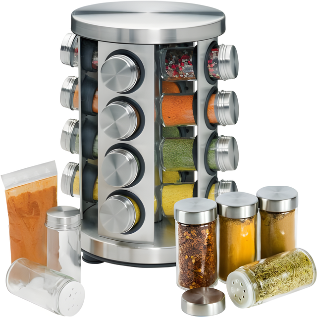 - Долговечность и стильный дизайн: Карусель для специй изготовлена из высококачественных материалов, таких как нержавеющая сталь и прочное стекло, обеспечивая долговечность и стильный внешний вид, который дополнит интерьер любой кухни;