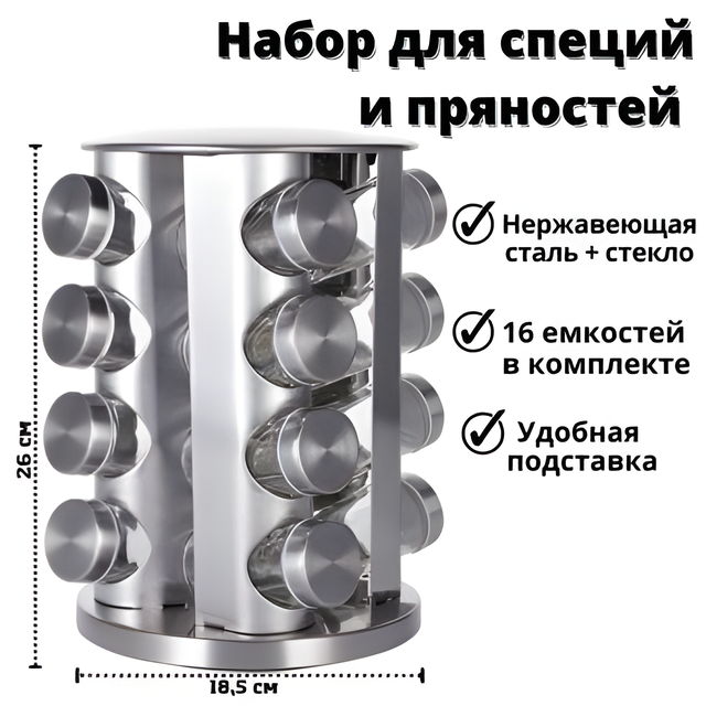 Это неотъемлемый помощник на вашей кухне, который приносит удобство и порядок в хранении и использовании специй. Она представляет собой элегантный набор, состоящий из подставки из нержавеющей стали и 16 стеклянных емкостей с крышками.