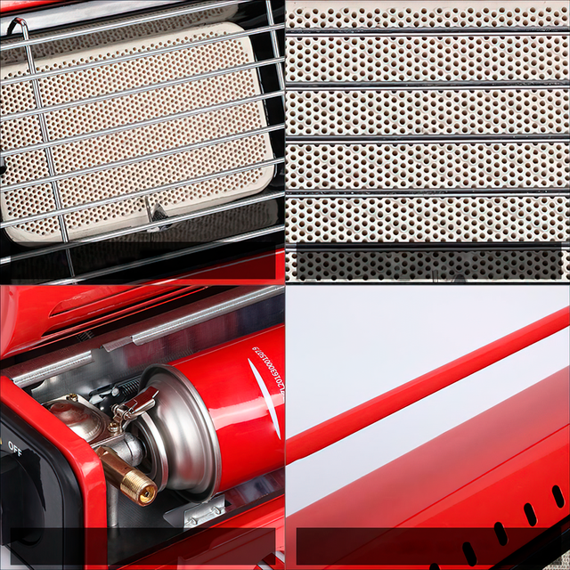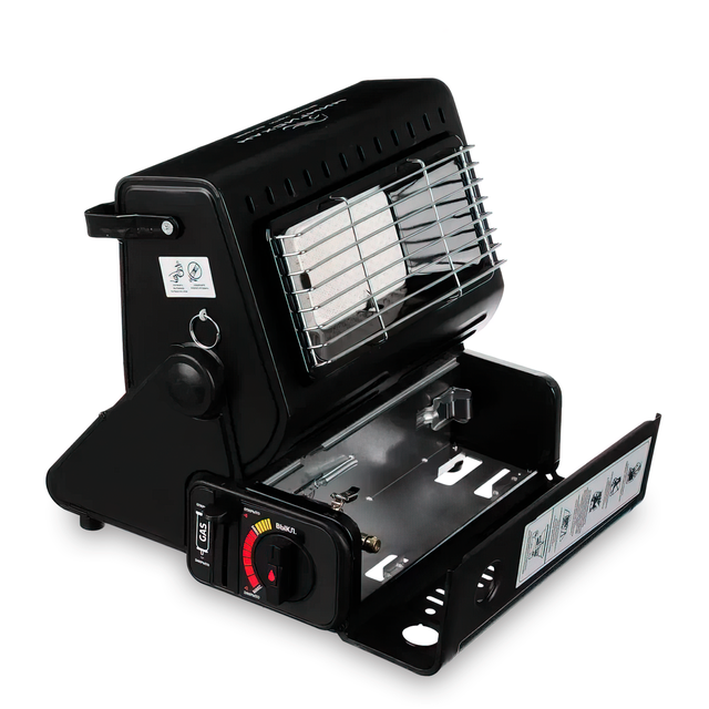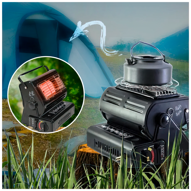 Переносной газовый обогреватель 2в1 оснащен керамическим нагревательным элементом, который отличается надежностью и длительным сроком службы. Устройство имеет решетку над нагревательным элементом, что делает возможным использование в качестве плиты для готовки. Обогреватель отлично подойдет для использования в шатрах, трейлерах, палатках, павильонах и небольших помещениях. Для обеспечения безопасности прибор оснащен предохранительным клапаном, устройством контроля давления и настройки защиты картриджа. Данная модель может использовать цанговые картриджи. Для удобства транспортировки имеется ручка.