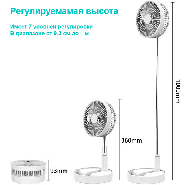 Уникальный переносной вентилятор представляет собой складную конструкцию, которую легко носить с собой. Устройство оснащено аккумулятором на 7200 мАч, что обеспечивает непрерывную работу 5 - 20 часов на одном заряде. Девайс работает тихо и непрерывно. Входящий в комплект кабель можно легко подключить к USB-порту ПК, ноутбука, мобильного блока питания или USB-адаптера питания. В комплект входит USB кабель, который можно подключить к ПК, ноутбуку, павербанку или просто розетке. Также устройство обладает телескопической регулировкой высоты в диапазоне от 36 до 100 см.