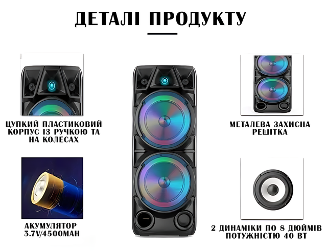 Портативная Bluetooth колонка ZQS-8210 – ваш идеальный спутник для любых событий. Удобная ручка и колёсики позволяют легко перемещать её куда угодно: на природу, дачу или в парк. Встроенная светомузыка с эффектными режимами добавляет атмосферы и создаёт настроение праздника.
