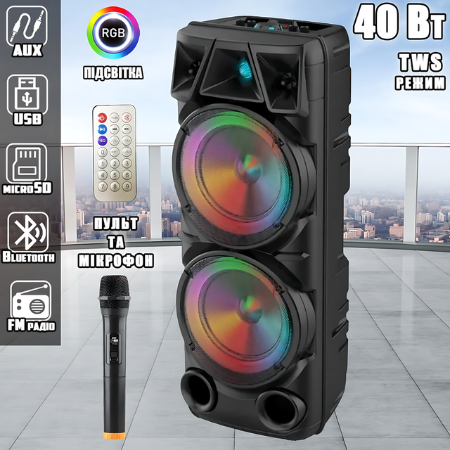 - Многофункциональность: Поддержка Bluetooth 5.0, USB, TF-карт, AUX и микрофонного входа.