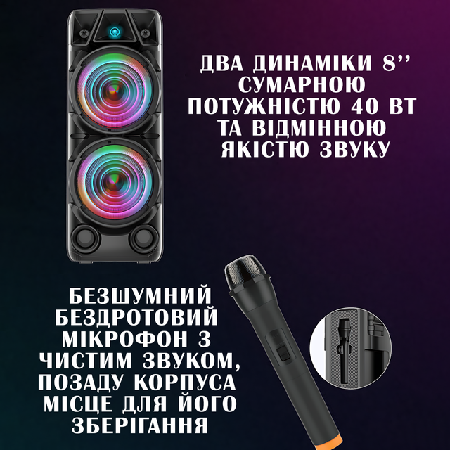 Аккумулятор ёмкостью 4500 мАч гарантирует несколько часов автономной работы, а мощные 8-дюймовые динамики обеспечивают насыщенный звук. ZQS-8210 идеально подойдёт для вечеринки, семейного торжества или уединённого отдыха под любимую музыку.