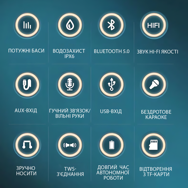 Водонепроницаемый корпус IPX6. Поддержка Bluetooth 4.2, AUX, USB, TF-карты. Встроенный Powerbank 6000 мАч. Функция караоке с микрофоном и даже режим TWS. Подключай вторую колонку и получай стерео как в зале. Всё для твоего кайфа, свободы и драйва.