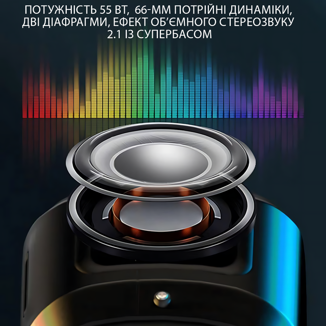 - ✔ 55 Вт мощного звука — 2 динамика + сабвуфер качают как надо