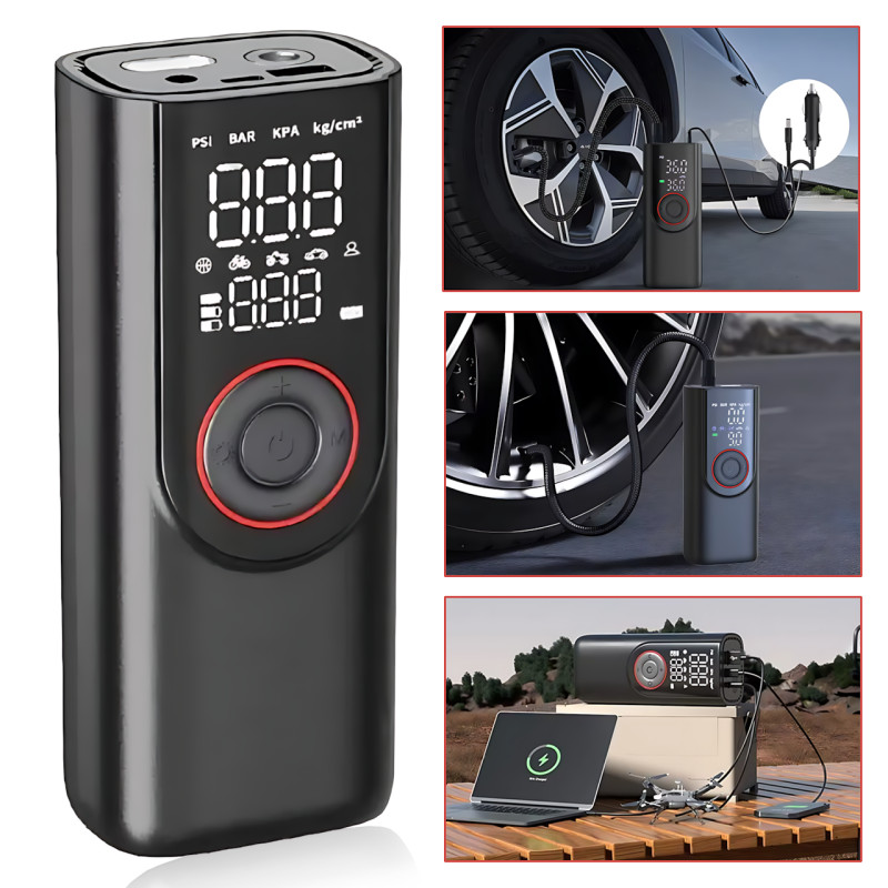 Максимальное давление до 150 PSI позволяет накачать авто и вело- колёса, а встроенные 3 аккумулятора по 2000 mAh обеспечивают до 30 минут работы без подзарядки.