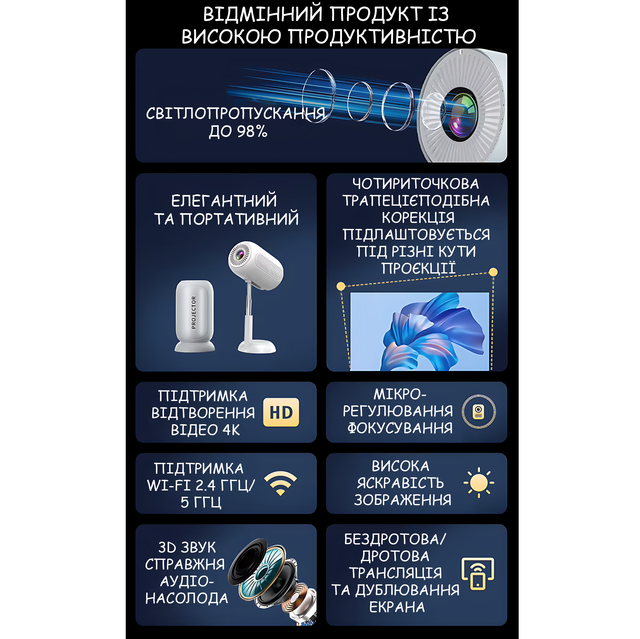 Этот компактный красавчик "Green Lion Venus" 4K создан для тех, кто любит кино, но...не любит ограничения. Включил — и у тебя дома полноценный мини-кинотеатр. Четкая Full HD картинка с поддержкой 4K. Яркость 240 ANSI, HIFI-звук и гибкая установка (благодаря встроенному скрытому кронштейну).