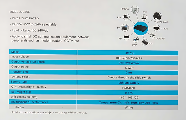 - Несколько выходных портов: Включая USB и DC, что позволяет одновременно подключать и заряжать несколько различных устройств. Это повышает его универсальность и удобство в использовании, обеспечивая совместимость с множеством типов техники. В-третьих, поддержка разных уровней напряжения (9V/12V для DC и 15V/24V для POE) делает этот UPS подходящим для широкого круга электронных устройств, от маршрутизаторов до видеонаблюдения, и обеспечивает гибкость в выборе оборудования для подключения;