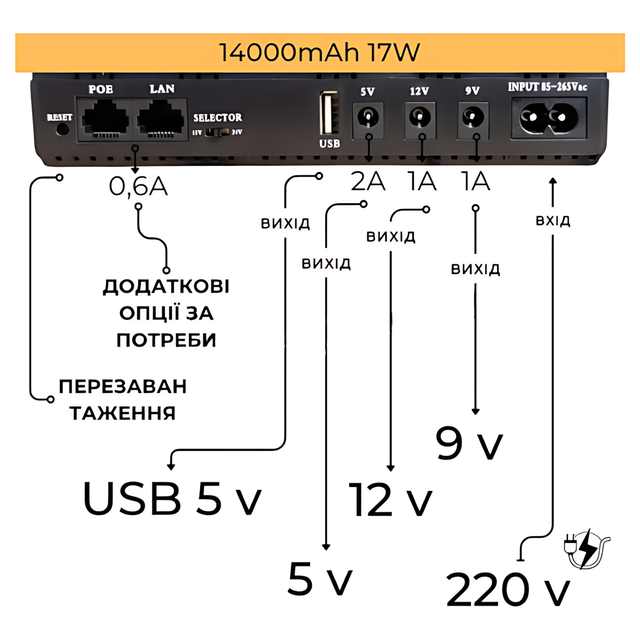 - Высокая емкость: 14000mAh гарантирует длительное время автономной работы, что особенно важно при частых или длительных отключениях электроэнергии. Это позволяет роутерам, модемам, IP-камерам и другим устройствам работать без перебоев, обеспечивая постоянный доступ к интернету и безопасности;