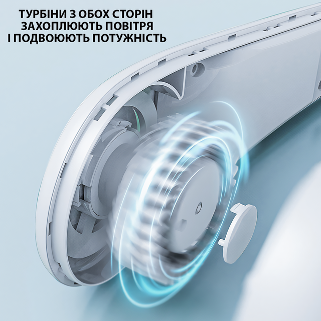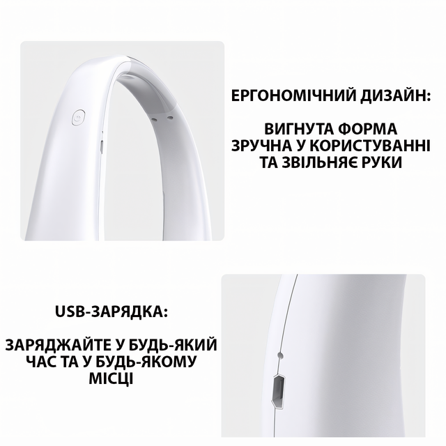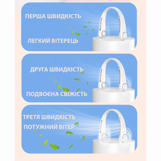 Мини-вентилятор на шею с аккумулятором обеспечивает стабильный и направленный обдув с двух сторон, имея 3 уровня интенсивности: умеренный, средний и сильный.