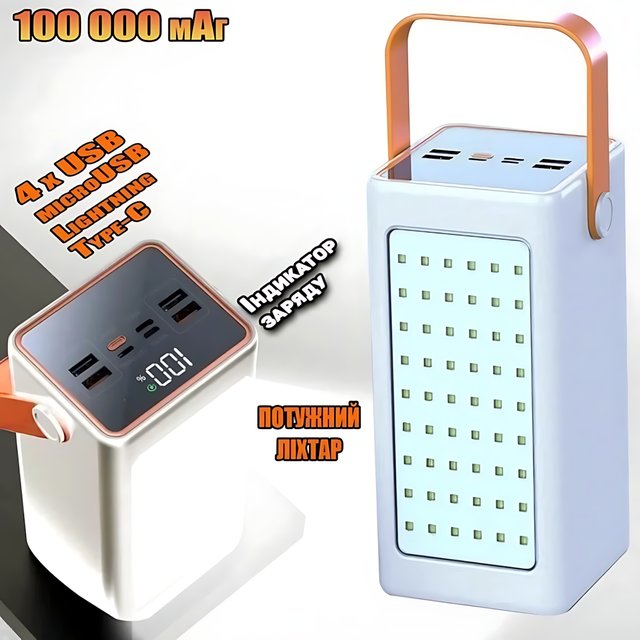 Power Bank 100 000 MAH, портативное зарядное YM-655 с быстрой зарядкой, 4 USB и ярким фонарем, белый