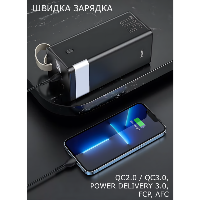 Если бы у спокойствия был свой генератор — он выглядел бы ровно так. PowerBank Hoco J86A — огромная портативная батарея с честной емкостью 50000 мАч, ускоренной зарядкой PD20W / QC3.0 22.5W, мощным фонариком и 3 портами для твоих гаджетов.