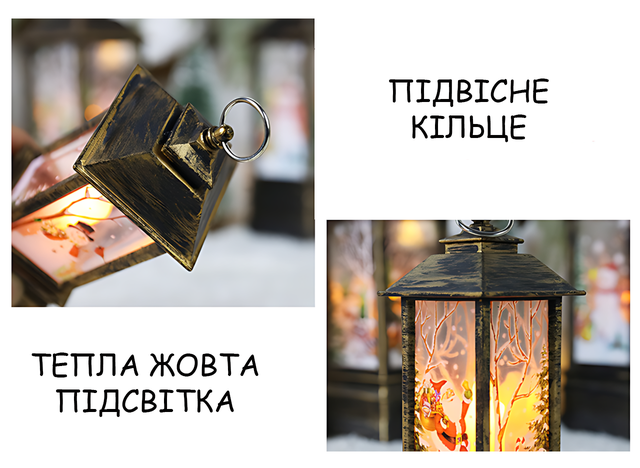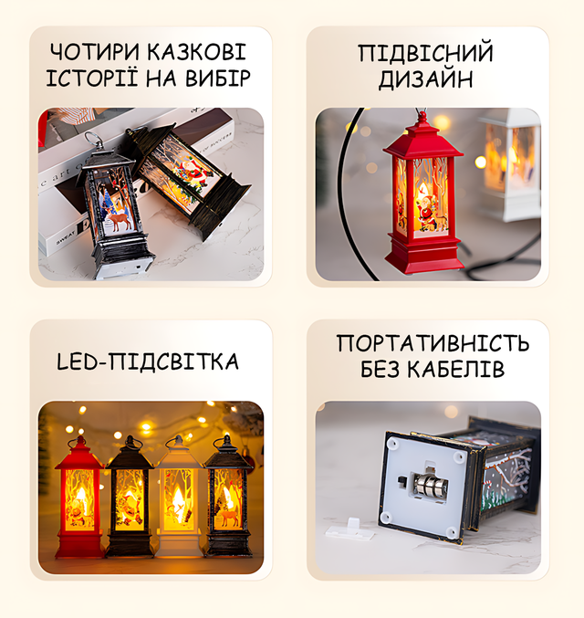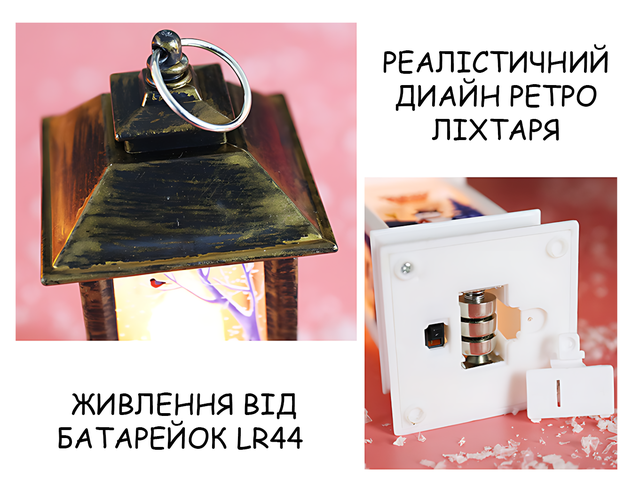 Корпус выполнен из прочного пластика (ПП, ПС) с элементами ретро-дизайна. Внутри — миниатюрные фигурки: Санта, Олень или Снеговик, каждая со своей зимней историей. Фонарик можно поставить на стол, повесить на ёлку, использовать как лампу-ночник.