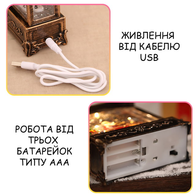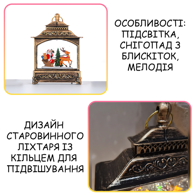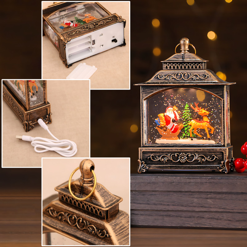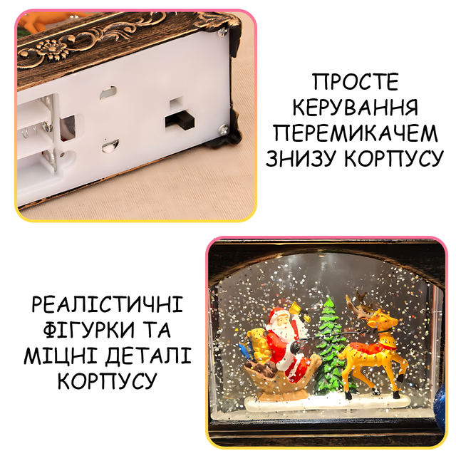 Фонарь создаёт уют и атмосферу даже без включения: внутри — фигурка Санты в санях, запряженных оленем, детально проработана с любовью. Теплая LED-подсветка и эффект снегопада делают фигурку живой, а приятная музыка добавляет волшебности.