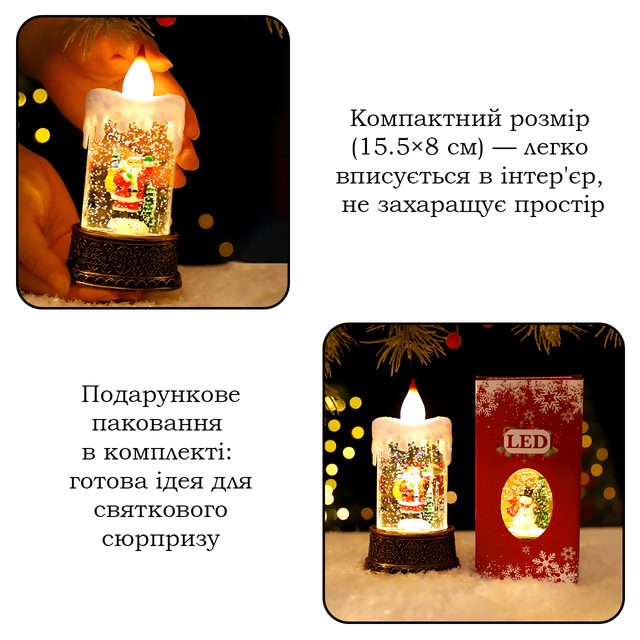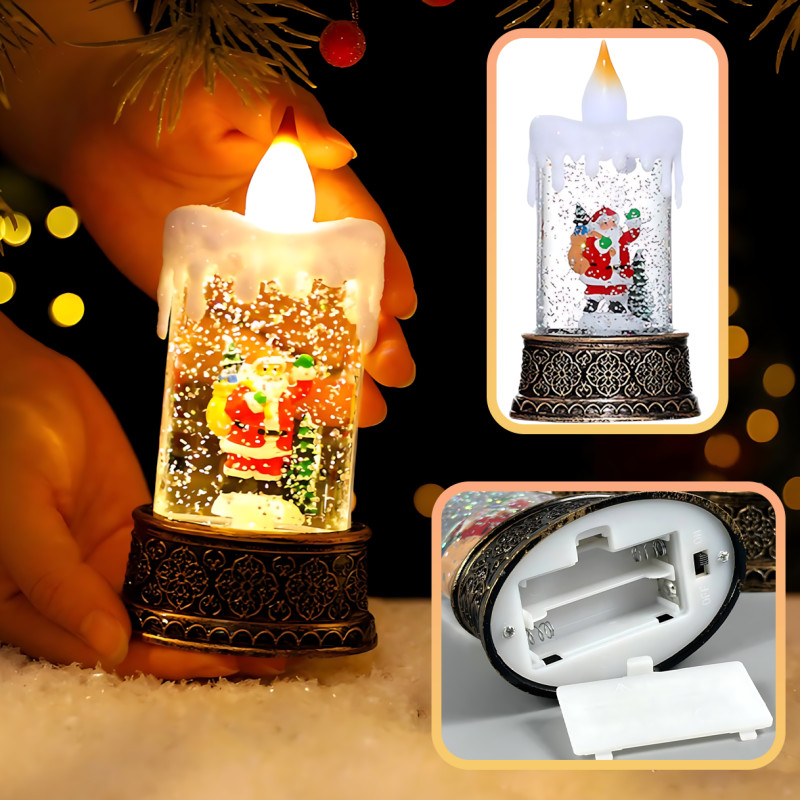 Праздничный ночник-свеча AT-D10S — это маленькое чудо, которое включается одним движением руки. В прозрачной колбе медленно вихрятса блестки... — будто зимний ветер подхватил снежинки и закружил их в тихом, мягком вальсе-хороводе. Атмосфера — ровно та, что в рождественских фильмах! За окном мороз рисует узоры, а дома свет теплый, добрый, очень живой.