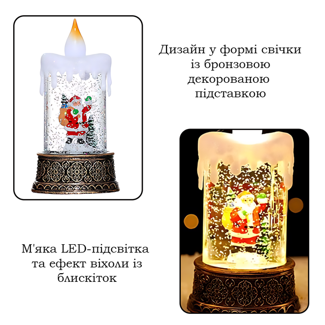 Корпус выполнен в форме классической свечи с «пламенем». Которое будто действительно дышит светом. Когда ночник включается, блестки начинают плавно двигаться в жидкости. Отражаясь в мягком LED-свечении. Это не яркая лампа — это свет для души: спокойный, ровный, нежный. Для вечеров, когда хочется просто быть. Себе. Дому. Теплу.