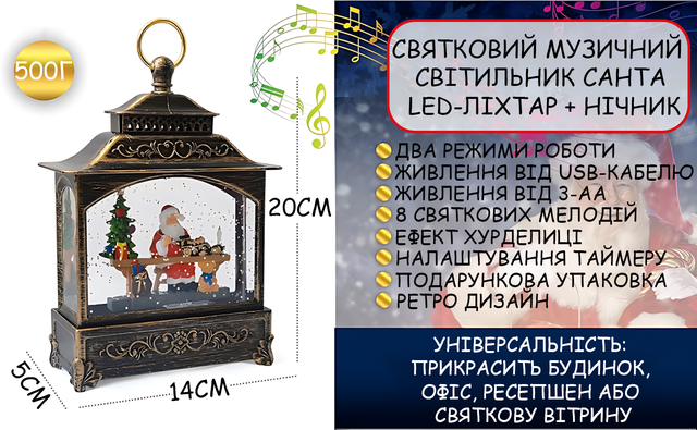 Праздничный музыкальный светильник Санта 800 от USB и батареек AA, 20×14×5 см — LED фонарь с эффектом кружения снега и музыкой