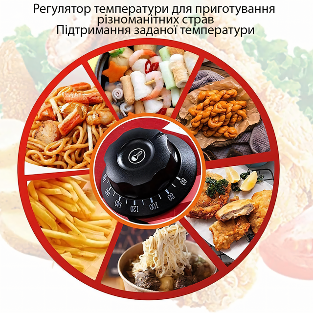 - Максимальная температура до 200°: Позволяет легко регулировать температуру для приготовления разнообразных блюд, начиная от хрустящего картофеля фри и заканчивая сочной жареной рыбой или мясом;