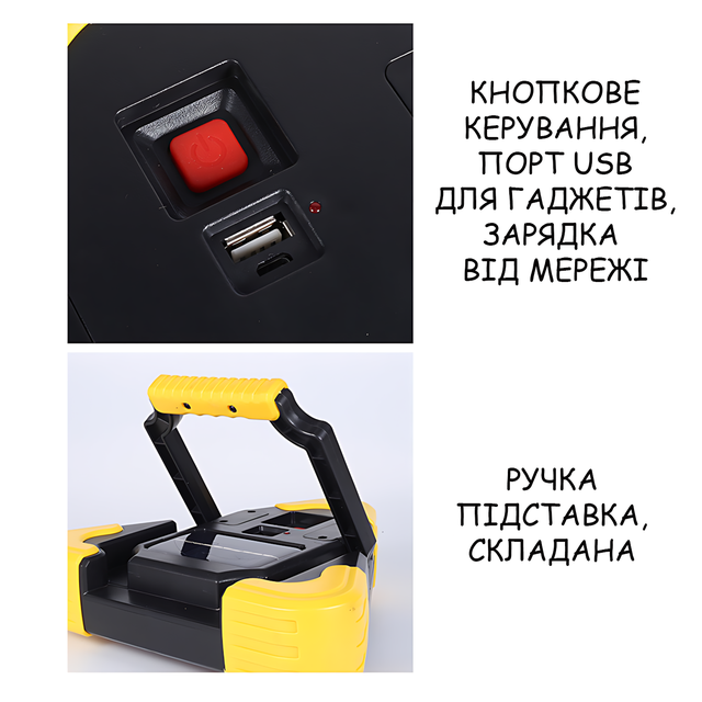 Прожектор оснащён яркими белыми светодиодами для основного освещения+красными для аварийных режимов. Работает от встроенного аккумулятора 2000 mah. Заряжается как от USB, так и от солнечной панели.