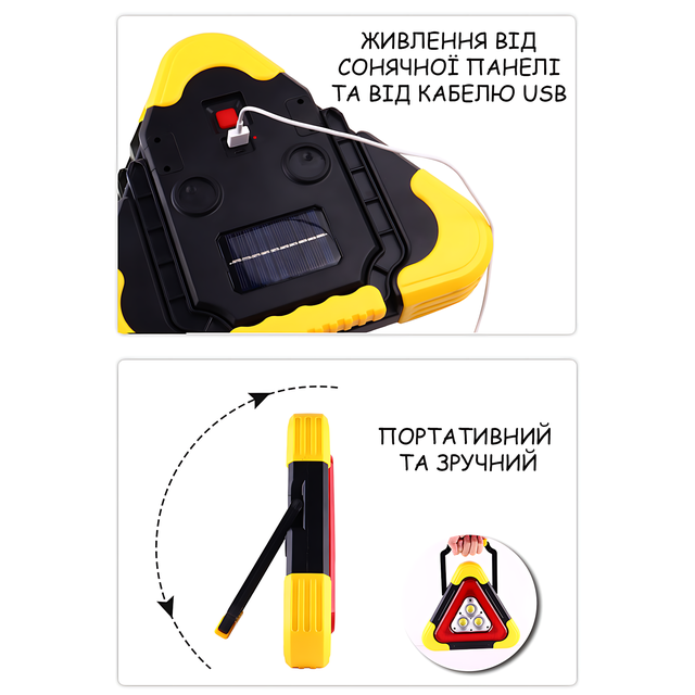 Прожектор светодиодный Hurry Bolt HB-7709 с солнечной панелью, аварийный LED-фонарь 500 лм, Power Bank, USB, красный сигнальный свет, треугольный корпус, поворотная рукоятка 180°