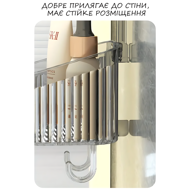 Эта компактная полочка на присосках – идеальное решение для хранения косметики и аксессуаров в ванной. Она легко крепится к стене без сверления, что делает установку простой и безопасной для поверхности. Благодаря стильному современному дизайну полка вписывается в любой интерьер, придавая ванной комнате аккуратный и организованный вид. Прочные присоски обеспечивают надежное крепление, а встроенные крючки позволяют удобно развесить полотенца и другие предметы. Полочка экономит место, не занимая много пространства, но обеспечивая достаточно места для хранения. Прозрачный пластик делает изделие незаметным и элегантным. Размеры 30х22х10,8 см позволяют использовать её в небольших ванных комнатах.