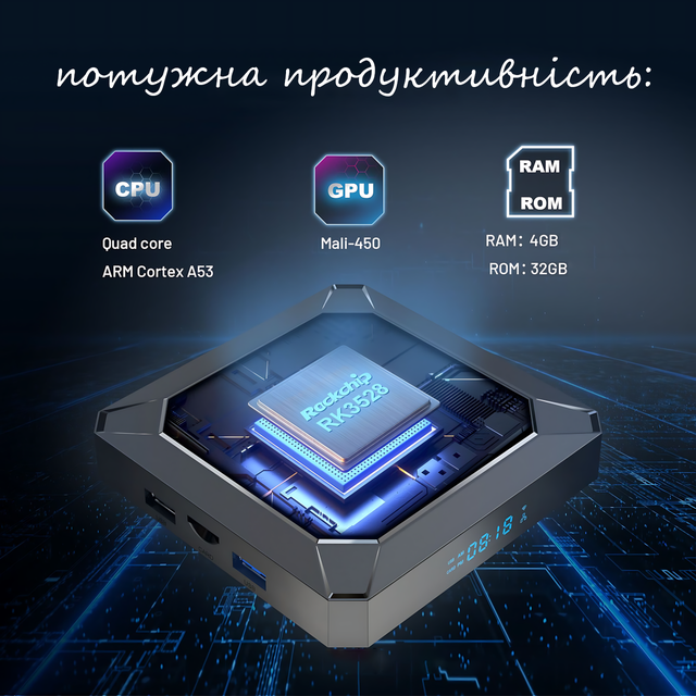 Памяти 4/32 ГБ хватит для приложений, а при желании добавишь microSD или внешний диск. Работает тихо, быстро и без перегрева. Подключается к любому телевизору: новому — через HDMI, старому — через AV-выход.