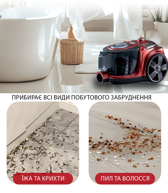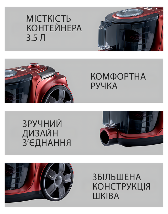 Пылесос Crownberg CB-0115 — 3000 Вт, циклонный, 3.5 л, HEPA-фильтр, безмешковый, контейнерный, красный