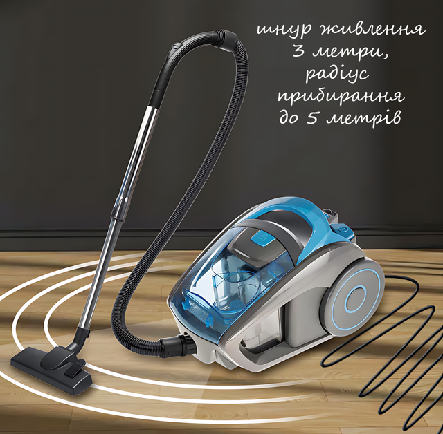 Пылесос Domotec MS-4404 контейнерный, 3000 Вт, циклонная система, HEPA-фильтр, сухая уборка, телескопическая труба, 3 л контейнер, серый с голубым