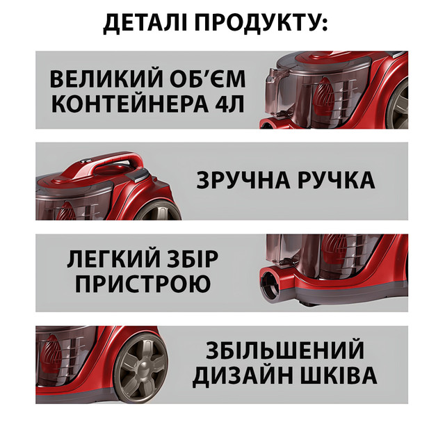 Пылесос Zepline ZP-6804 4000 Вт с контейнером 4 л, циклонный, HEPA-фильтр, телескопическая трубка, красный Фиолетовый