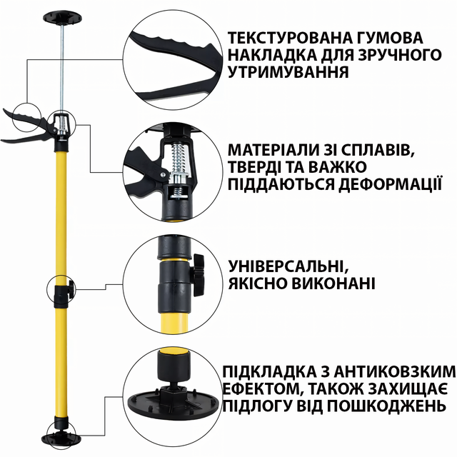 - Регулируемая высота: Механизм регулировки высоты позволяет настроить опору в диапазоне от 50 до 115 см, что делает её универсальным инструментом для различных задач и условий использования;