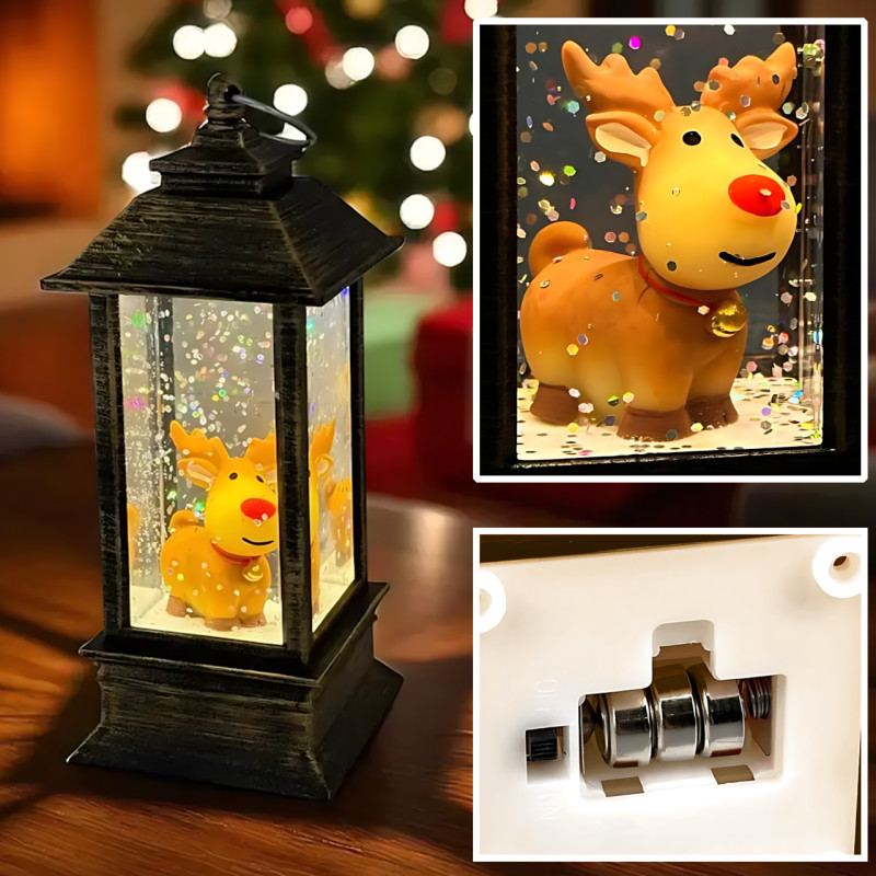 Внутри фонаря — очаровательные 3D-фигурки в жидкой среде: красный ретро-фонарь с Санта-Клаусом, белый с новогодней ёлочкой или бронзовый с изящным оленем. Мягкая LED-подсветка внутри высвечивает фигурку изнутри, создаёт эффект волшебного сияния и превращает обычный уголок комнаты в уютную праздничную сцену.