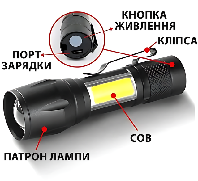 Ручной фонарик BL 513 USB с XPE + COB LED, 500 лм, зумом, встроенным аккумулятором, 3 режимами и влагозащитой