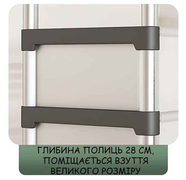 В 4 просторные полки легко помещается до 15 пар обуви — от лёгких балеток до брутальных ботинок.