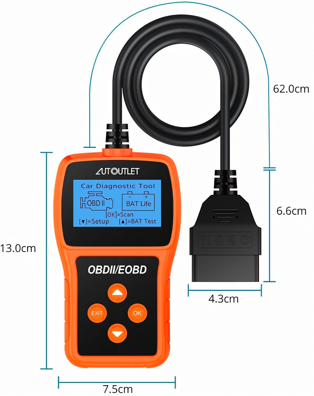 AUTOUTLET OBD2 Scanner - это мощный инструмент для диагностики автомобильных двигателей, который поможет вам быстро определить коды неисправностей, проанализировать их определения DTC, а также оценить состояние заряда батареи вашего автомобиля.