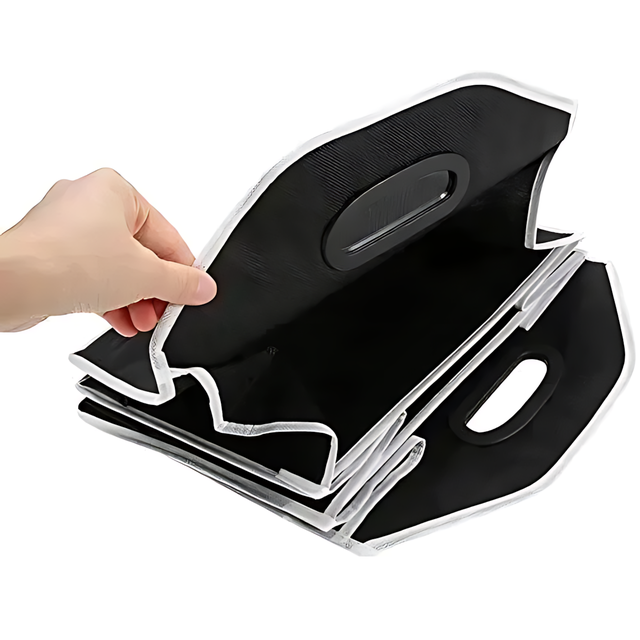 - Компактность и универсальность: Органайзер может быть уменьшен вдвое или полностью сложен, что позволяет экономить место в багажнике и хранить его под сиденьем;
