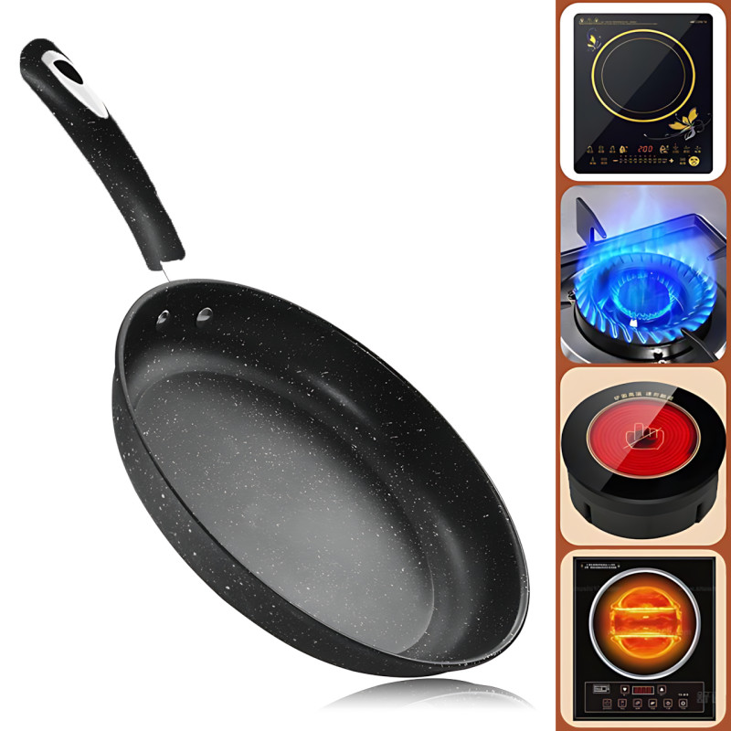- ✔ Антипригарное покрытие – трехслойное мраморное покрытие предотвращает пригорание пищи и облегчает очистку.