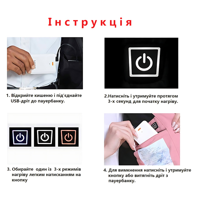 - Совместимость с USB-устройствами: Жилет работает от обычного павербанка через USB-разъем, что делает его совместимым с большинством доступных на рынке аккумуляторов. Это удобно, так как не требуется покупка специального аккумулятора;