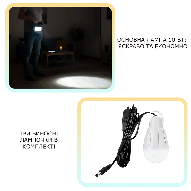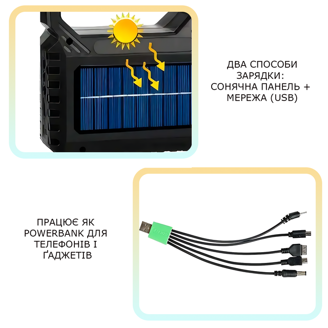 Солнечная зарядная станция, аккумуляторный фонарь OK-718S-B 10W + Солнечная панель, 3 выносные лампочки, COB-боковая подсветка, PowerBank, зарядка от солнца и сети