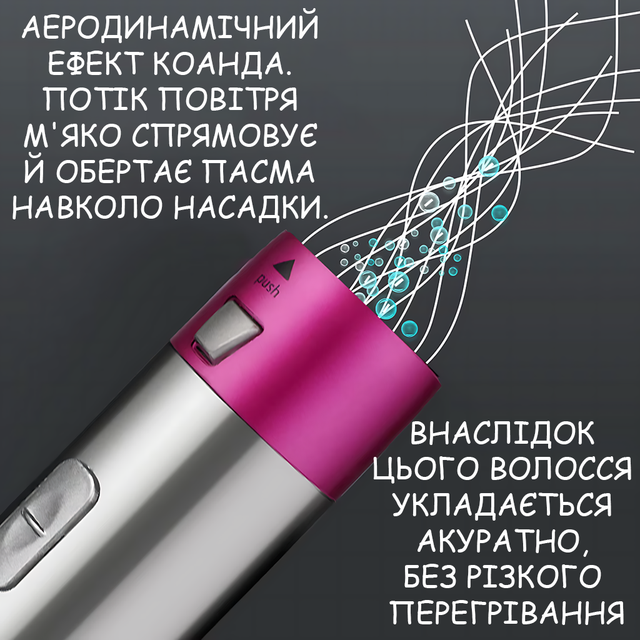 Стайлер работает по принципу горячего воздуха + использует аэродинамический эффект Коанда. Поток воздуха мягко направляет и оборачивает пряди вокруг насадки. В результате волосы укладываются аккуратно, без резкого перегрева