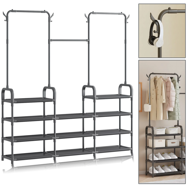 Элегантный чёрный цвет, надёжный металл, четыре полки, крючки и продуманная конструкция — всё, что нужно, чтобы собрать гардероб в одном месте и не искать второй ботинок по утрам.