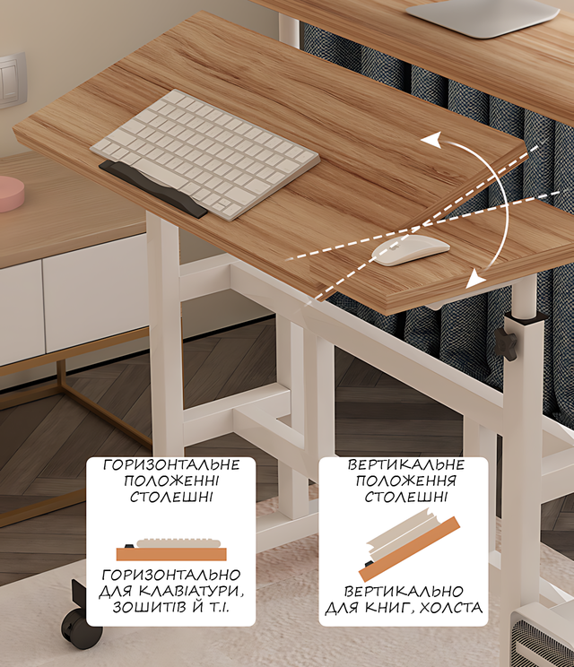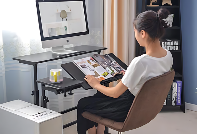 Идеально подходит для работы или учебы, так как можно работать стоя и сидя, можно менять угол наклона рабочей поверхности. А полочка для пк или ящика с документами или книгами, например, может быть расположена как слева, так и справа.