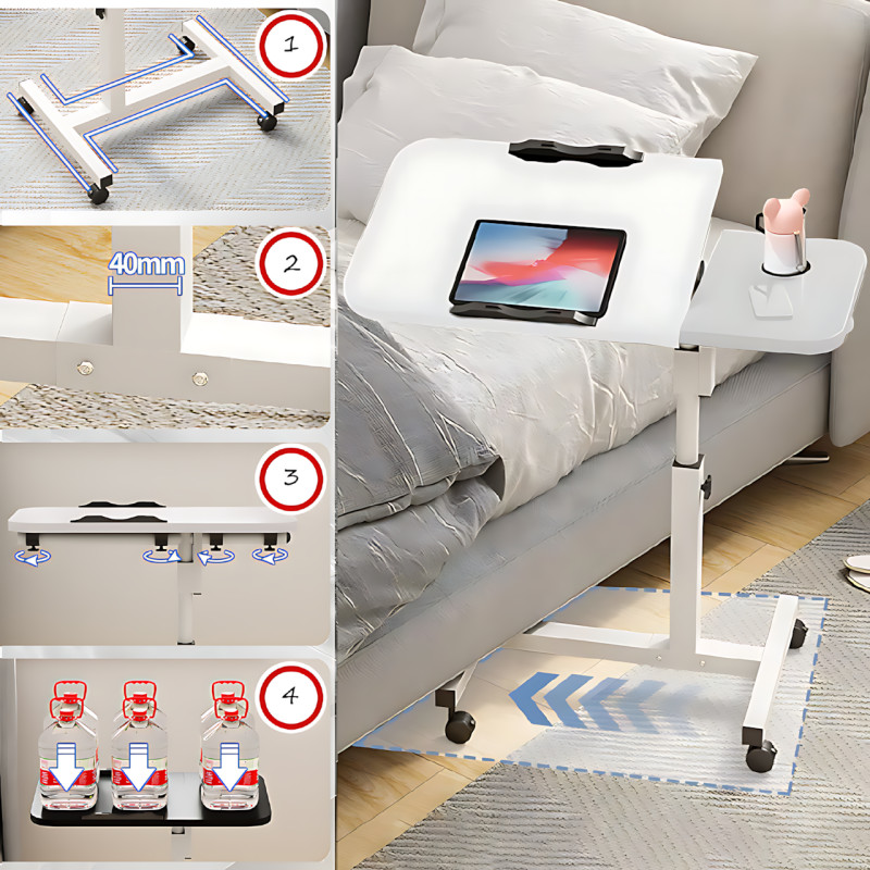 - Наклонная столешница: ручка прикроватного столика расположена рядом со столешницей для регулировки угла наклона. Вы можете настроить угол стола по своему усмотрению. Закругленные углы стола делают его безопаснее в использовании;