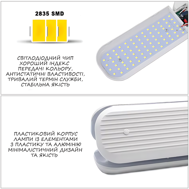 Светодиодная складная лампа FAN Blade LED Bulb с тремя лопастями и мощностью 60 Вт представляет собой универсальное осветительное устройство с цоколем E27. Она оснащена тремя независимыми лепестками, каждый из которых имеет свою микросхему драйвера 75CKL8M2YU, что позволяет использовать каждый лепесток как отдельную лампу. Подложка, на которой расположены светодиоды, выполнена из алюминия толщиной 1 мм.
