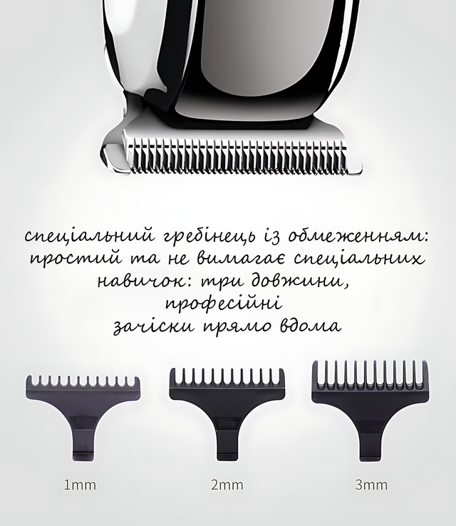 - 🧩 3 съёмные насадки — регулировка длины стрижки (до 3 мм)