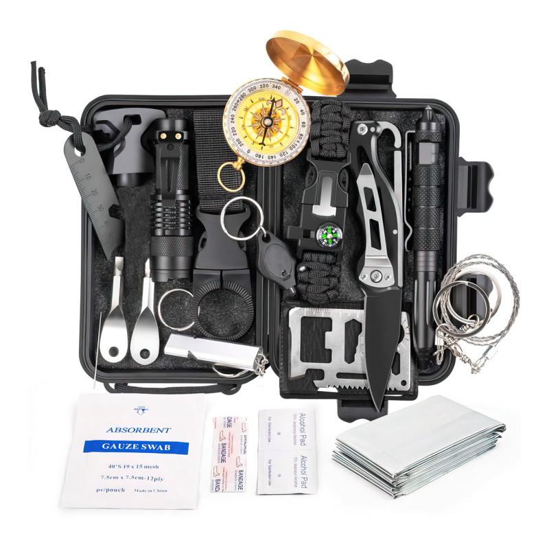Представленный набор для выживания 18 в 1 является отличным подарком для людей, увлеченных туризмом и активным отдыхом, так как он может оказаться незаменимым во многих ситуациях, связанных с путешествиями, кемпингом и экстремальными видами спорта. В наборе собраны различные инструменты, такие как складной нож, многофункциональный браслет, тактическая ручка, фонарик, компас, пила, зажим для воды, многофункциональный инструмент, аварийное одеяло, свисток, мини-фонарик, инструмент 6в1, отвертка, водонепроницаемый и ударопрочный кейс для переноски, а также предметы, необходимые для оказания первой помощи, такие как пластырь, повязка, игла и спиртовая подушечка.