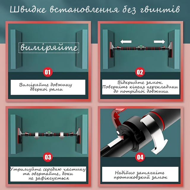 Устанавливается без единого винта! Прямо в дверной проём шириной от 130 до 157 см. Никаких дыр в стенах! Никаких лишних инструментов — закрепил, подтянулся и готов к тренировке.