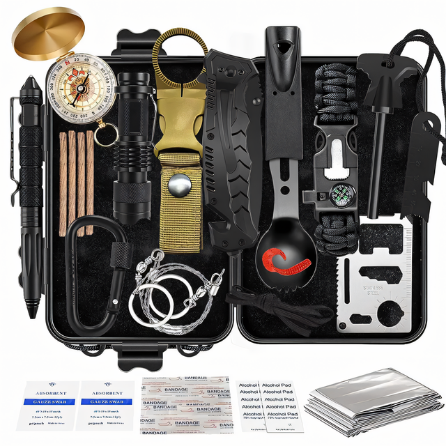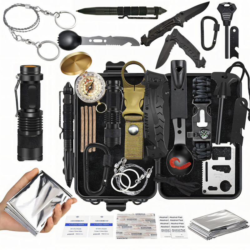- Полная комплектность: Комплект содержит широкий спектр инструментов и предметов выживания, от критически важных, таких как пила, фонарь и браслет из паракорда, до незаметных, но полезных, таких как кемпинговые принадлежности и карабин для бутылки;