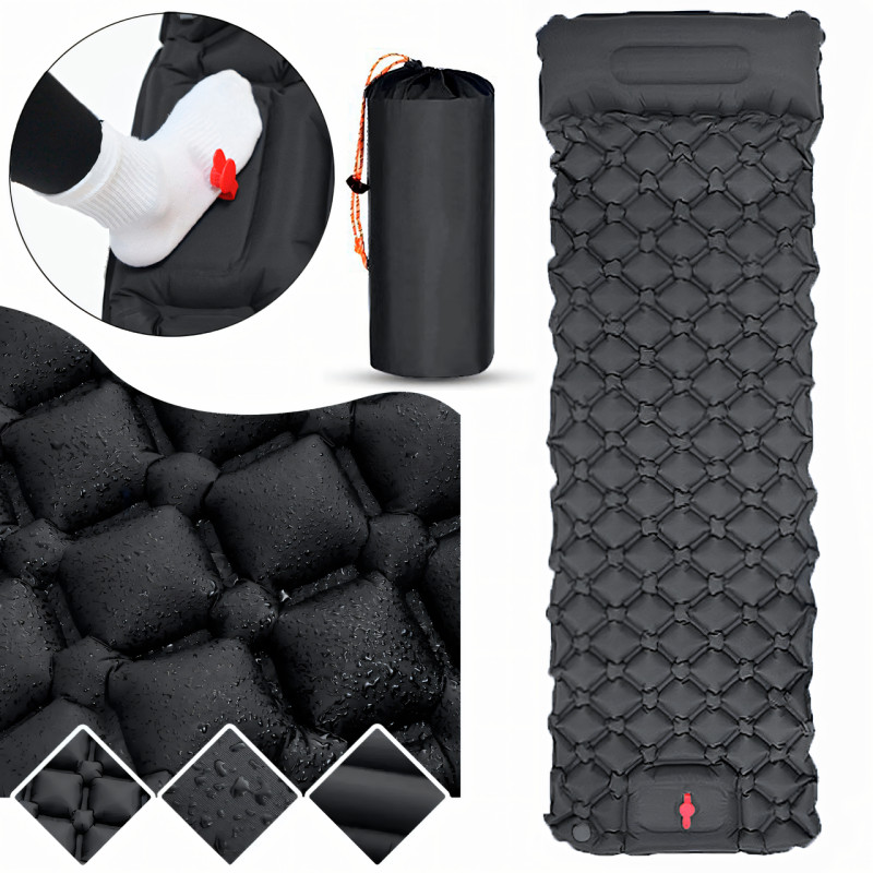 Туристический надувной матрас с подушками Outdoor Sleeping со встроенным насосом, черный нейлон, 190х60х5 см